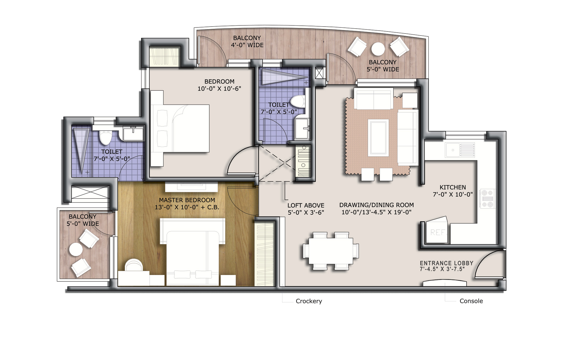 | Fittings | Granite/marble counter, white sanitary ware and contemporary chrome plated fittings |